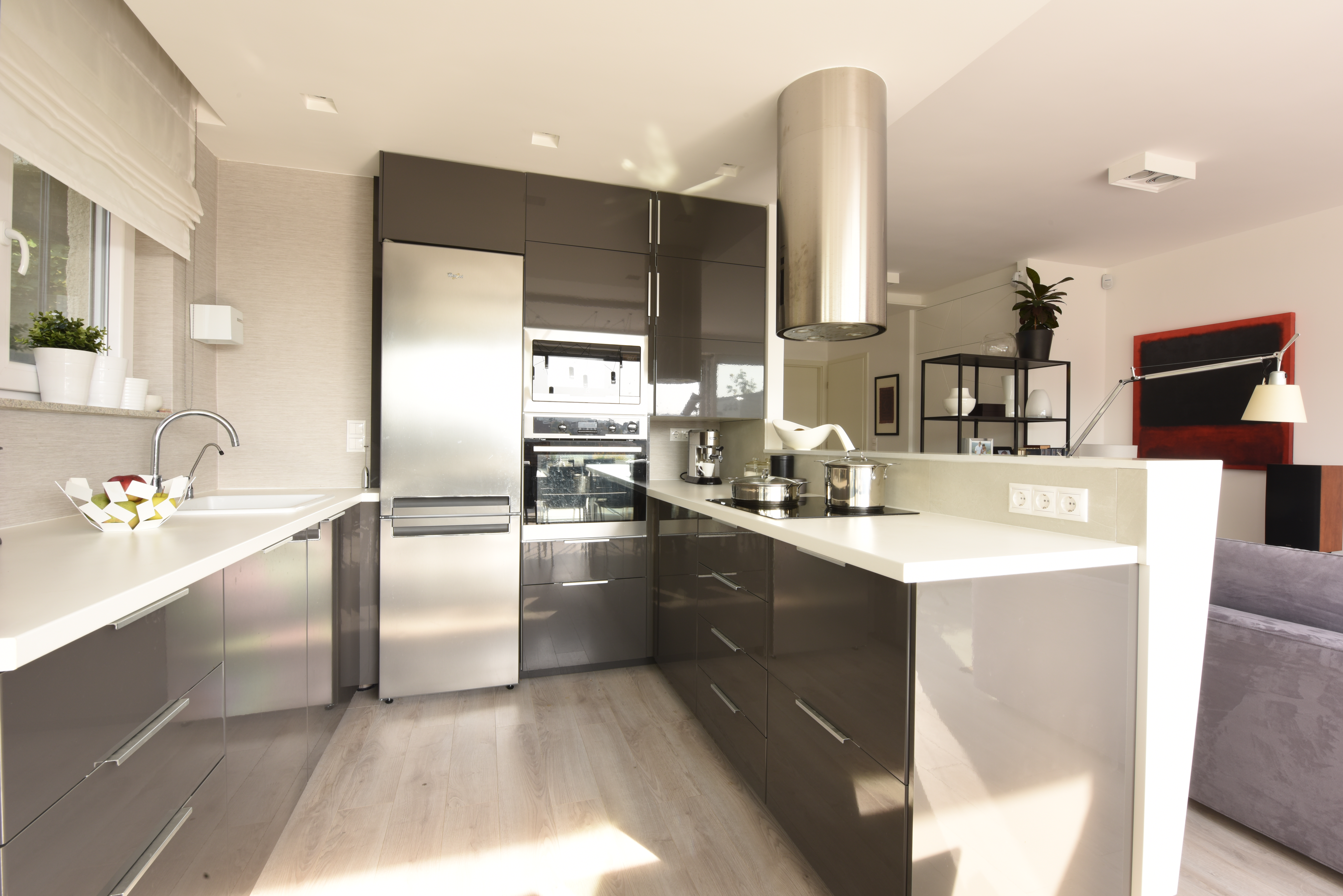 A szomszéd lakás megvásárlásával lehetőség nyílt az alapterület növelésére, ezzel viszont szükségessé vált a korábbi kislakás – lásd lejjebb – funkcionális módosítása is. A most már tágas lakásban a régi hálószoba helyén alakítottuk ki a konyhát. A teljeskörű újratervezés új stílust, új színhasználatot hozott, de a korábbi lakás néhány elemét most is sikerült felhasználni.