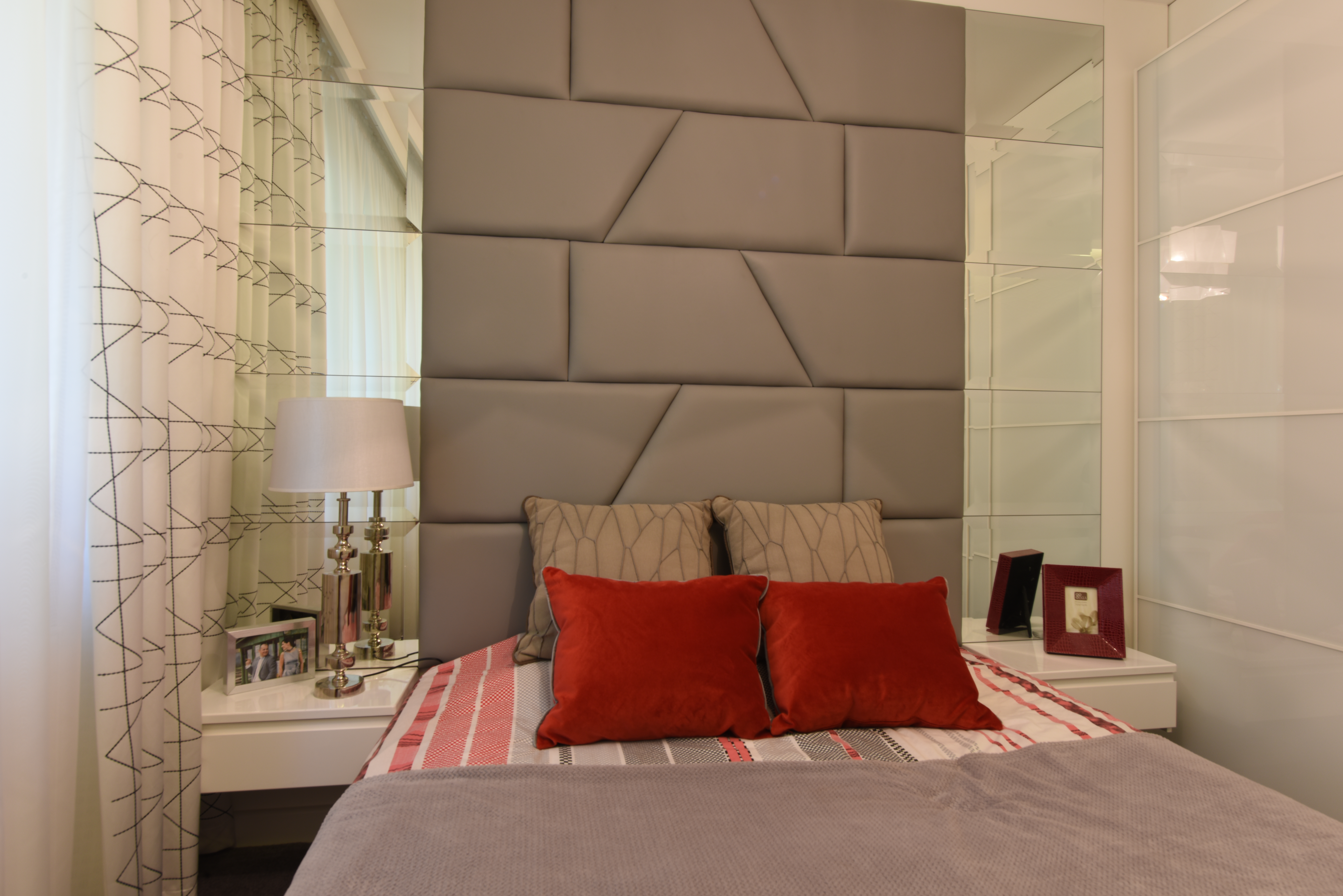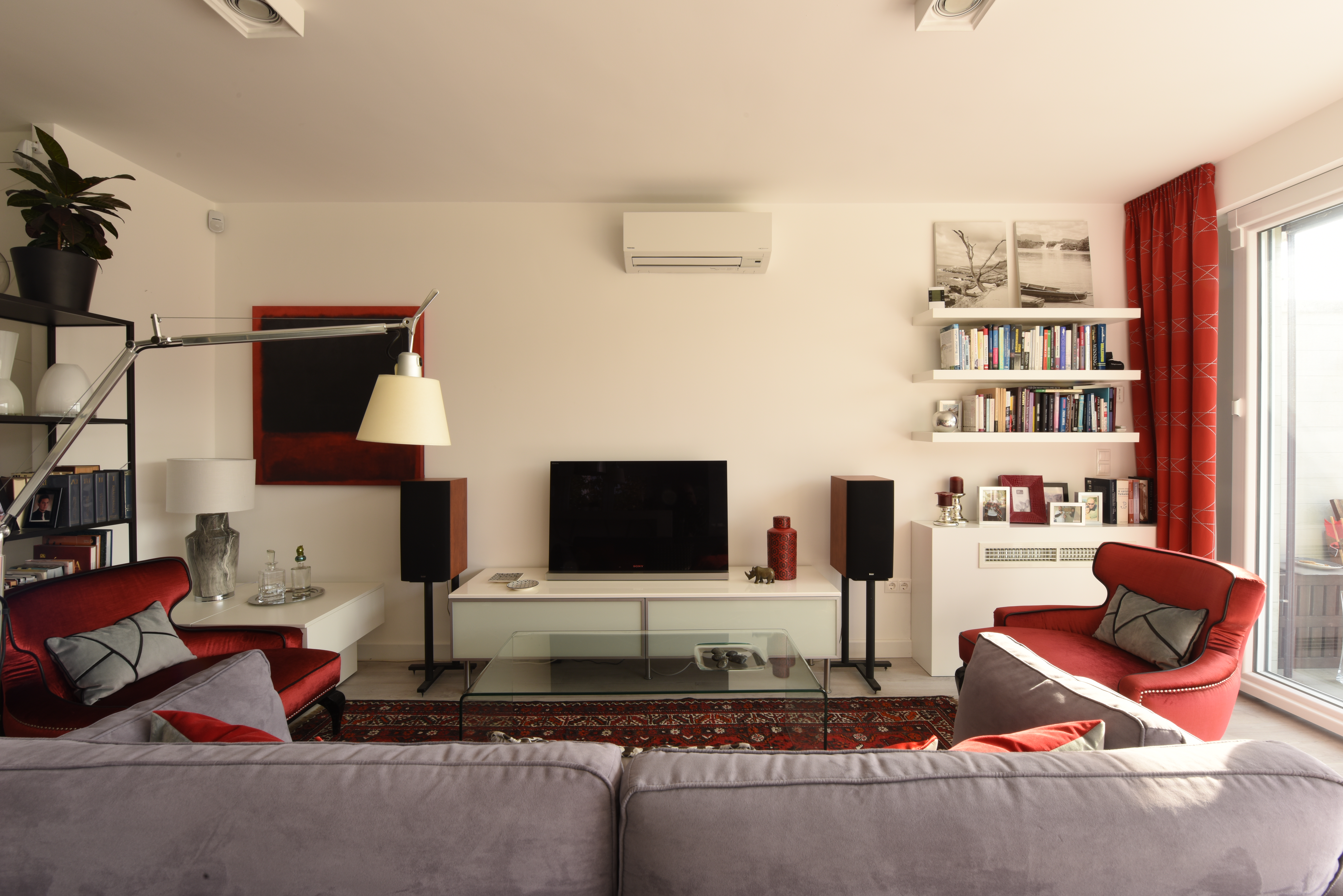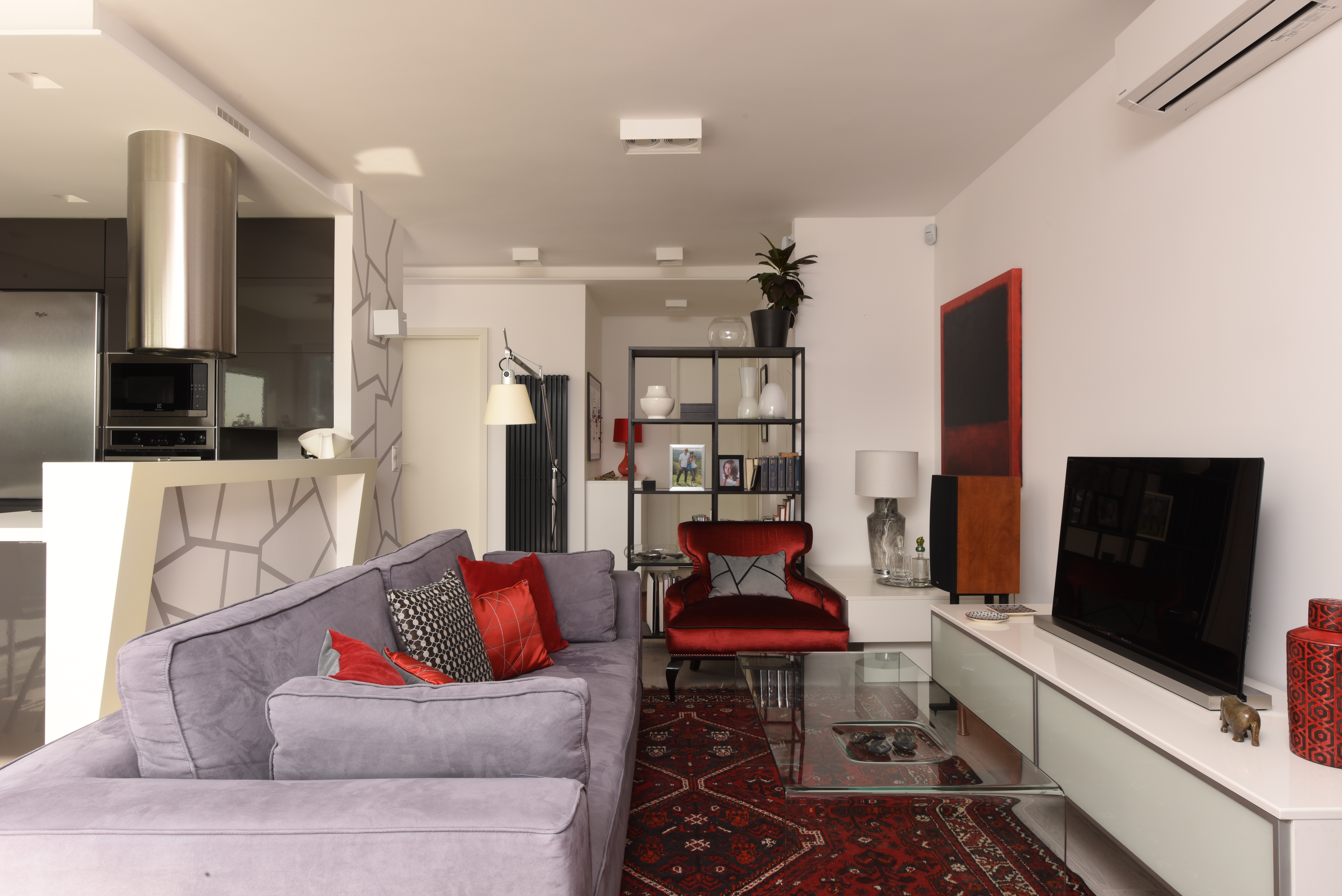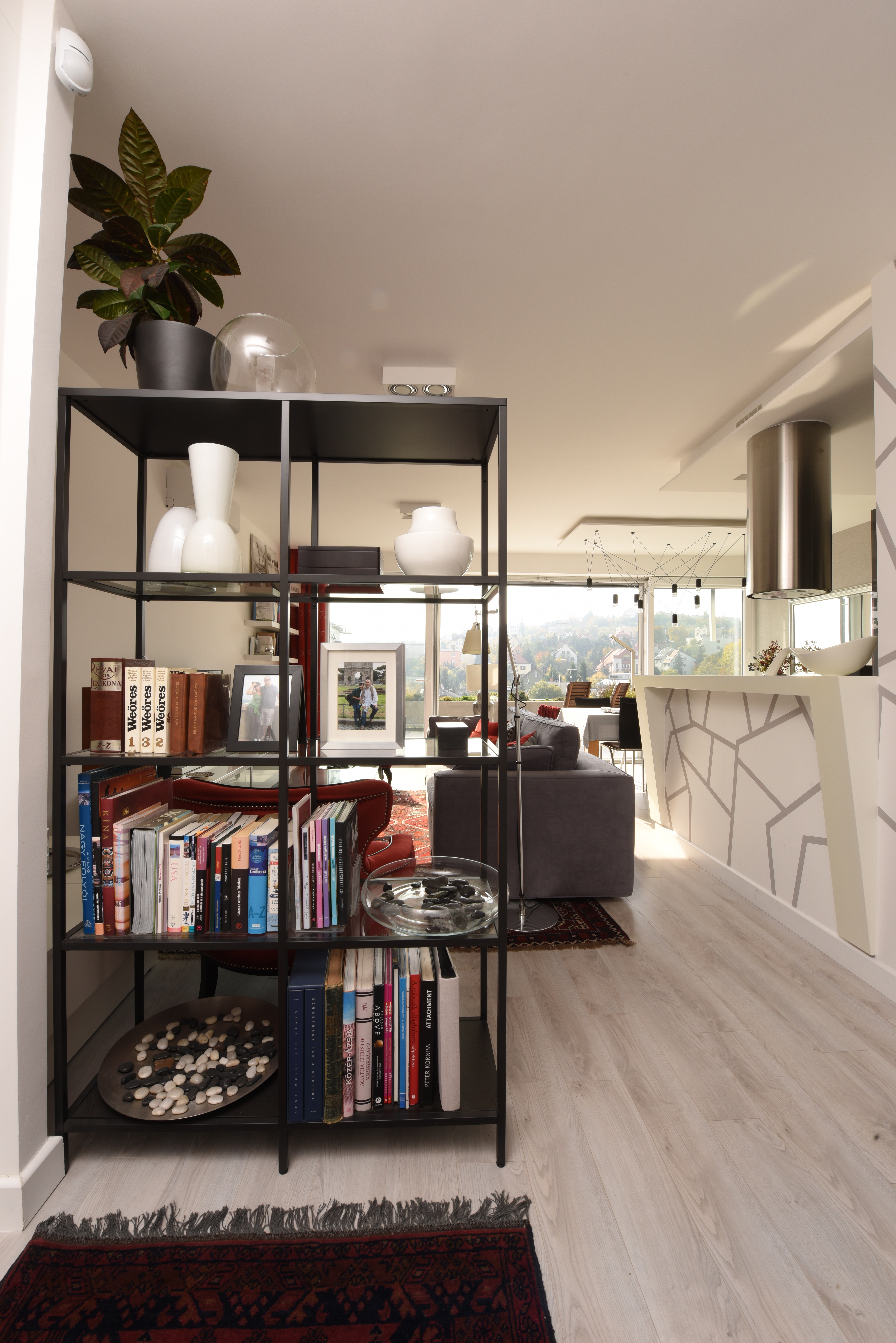 A 70-es években épült, többlakásos társasház legfelső emeletén lévő lakás teljeskörű felújítása, a kis alapterület ellenére tágas érzetű, modern otthon kialakítása volt a cél. Néhány meglévő berendezés – keleti szőnyegek, étkezőbútor és a 2 db piros fotel – szintén kötöttséget jelentett. A korábbi ablakos nappali tér terasz felé nyitása egyértelmű volt.