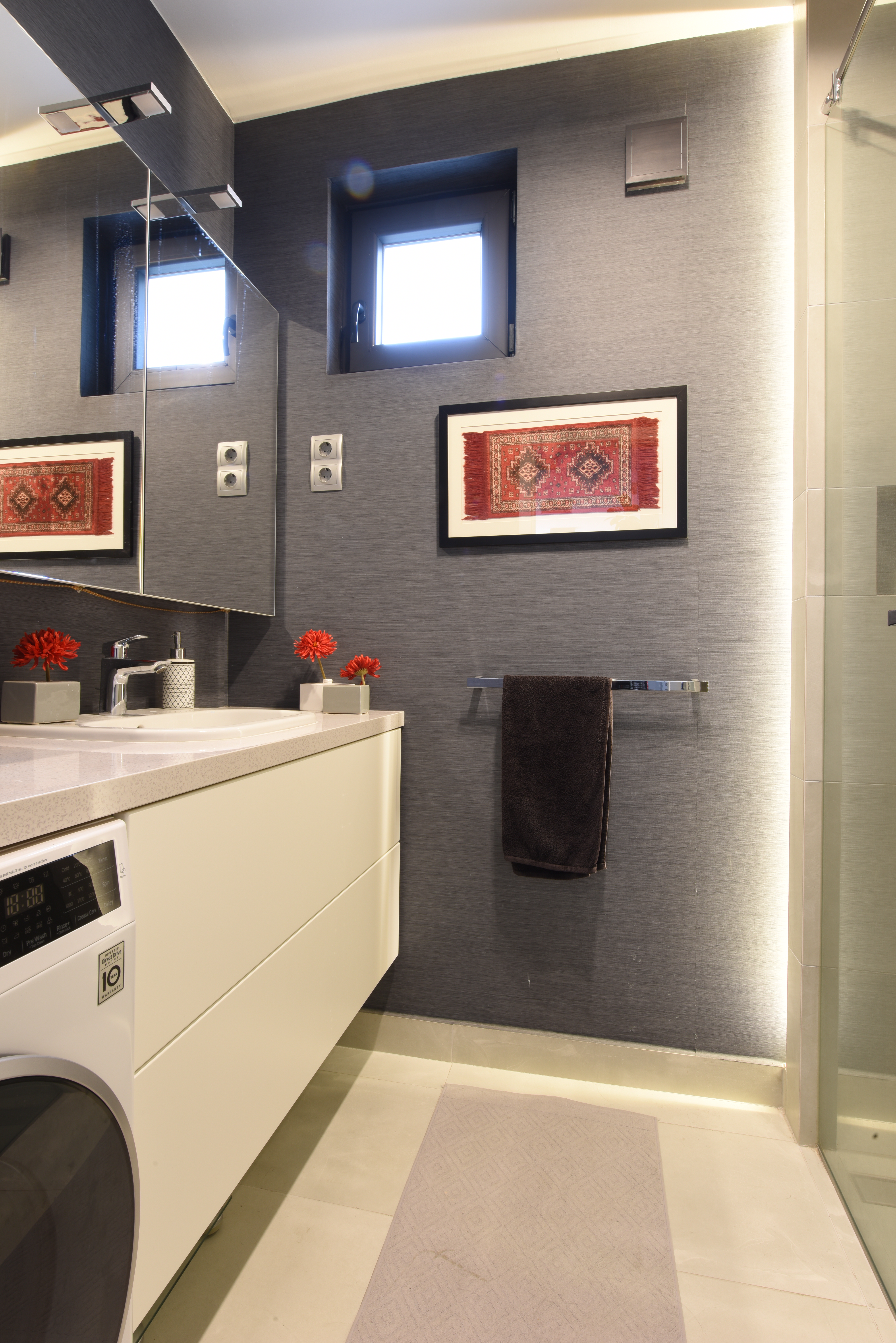 Rejtett fények biztosítják a hangulat változtathatóságát. A mosdó környékére Vescom viniltapéta került.