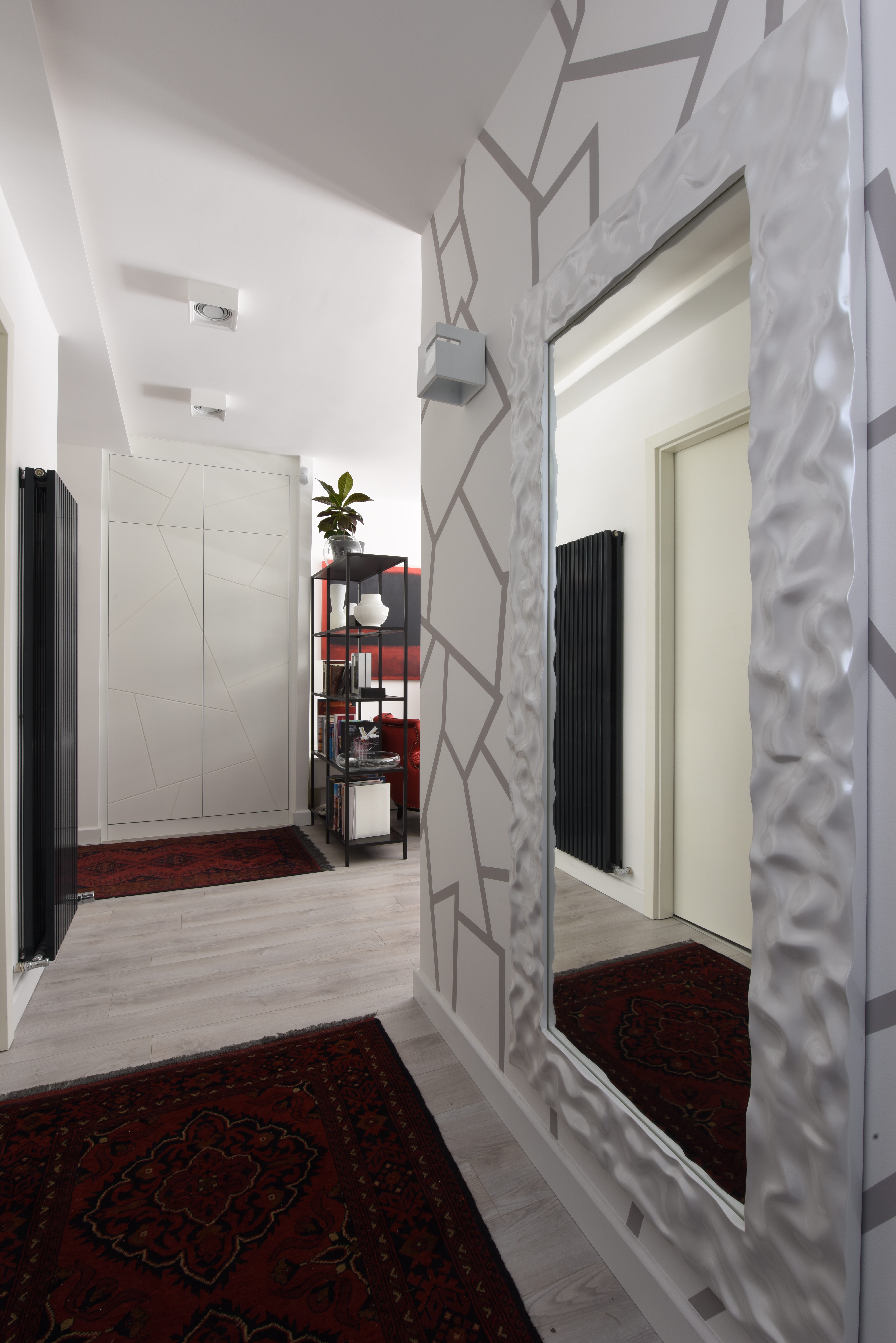 Nepáli szőnyegek és geometrikus mintázatok ötvözete az előszobában. Fotó: Székely Péter