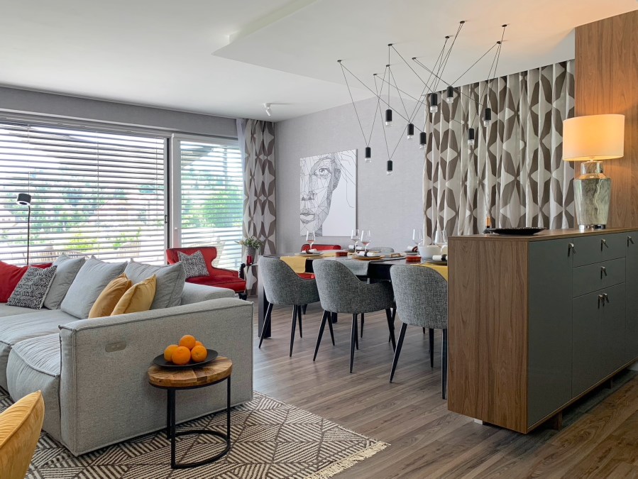 A jó minőségű zenehallgatást minden helyiségben fali hangszórók biztosítjákÜveg tolóajtóval szeparálható konyhaA szürke és barna felületek mellett jól érvényesülnek a meleg sárga árnyalatokEgyedi tervezésű médiafal az étkezőből nézveNappali-étkező, kilátás a teljes falszélességben futó teraszraA konyhabútor látványa az étkezőbőlA konyhabútorral egy blokkba tervezett tárolóelem, ami a vendégek kabátjainak is helyet adNappali-étkező, kilátás a teljes falszélességben futó teraszraNappali részlet, átlátással a hálószobák előterébeA szobák előtti közlekedőből belátás a hálószobábaMerész színhasználat és eklektika jellemzi a hálószobátPazar városi panoráma tárul szemünk elé a hálószobaablakban ülveHidegburkolat nélkül készült a kádas fürdőszobaHidegburkolat nélkül készült a kádas fürdőszoba