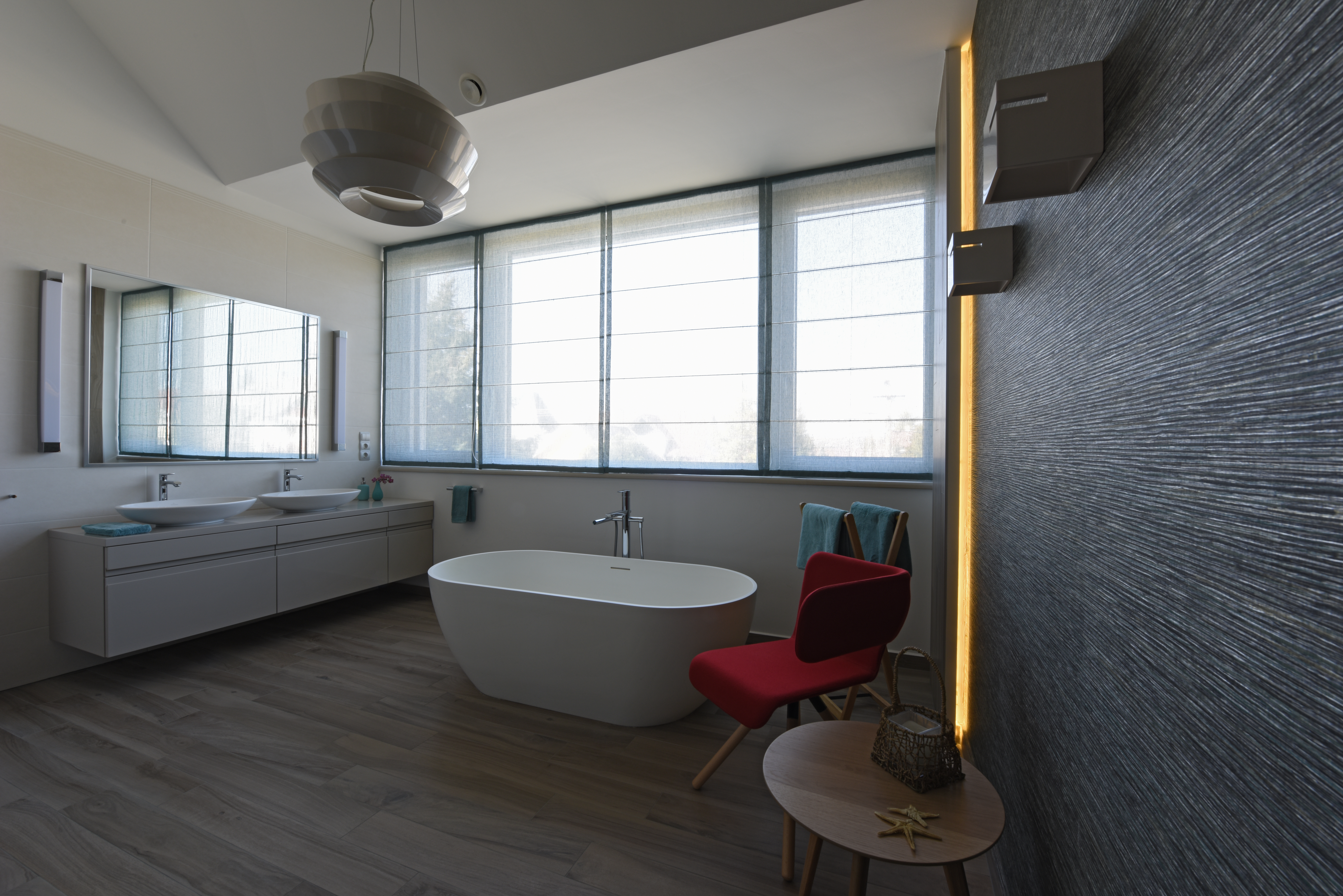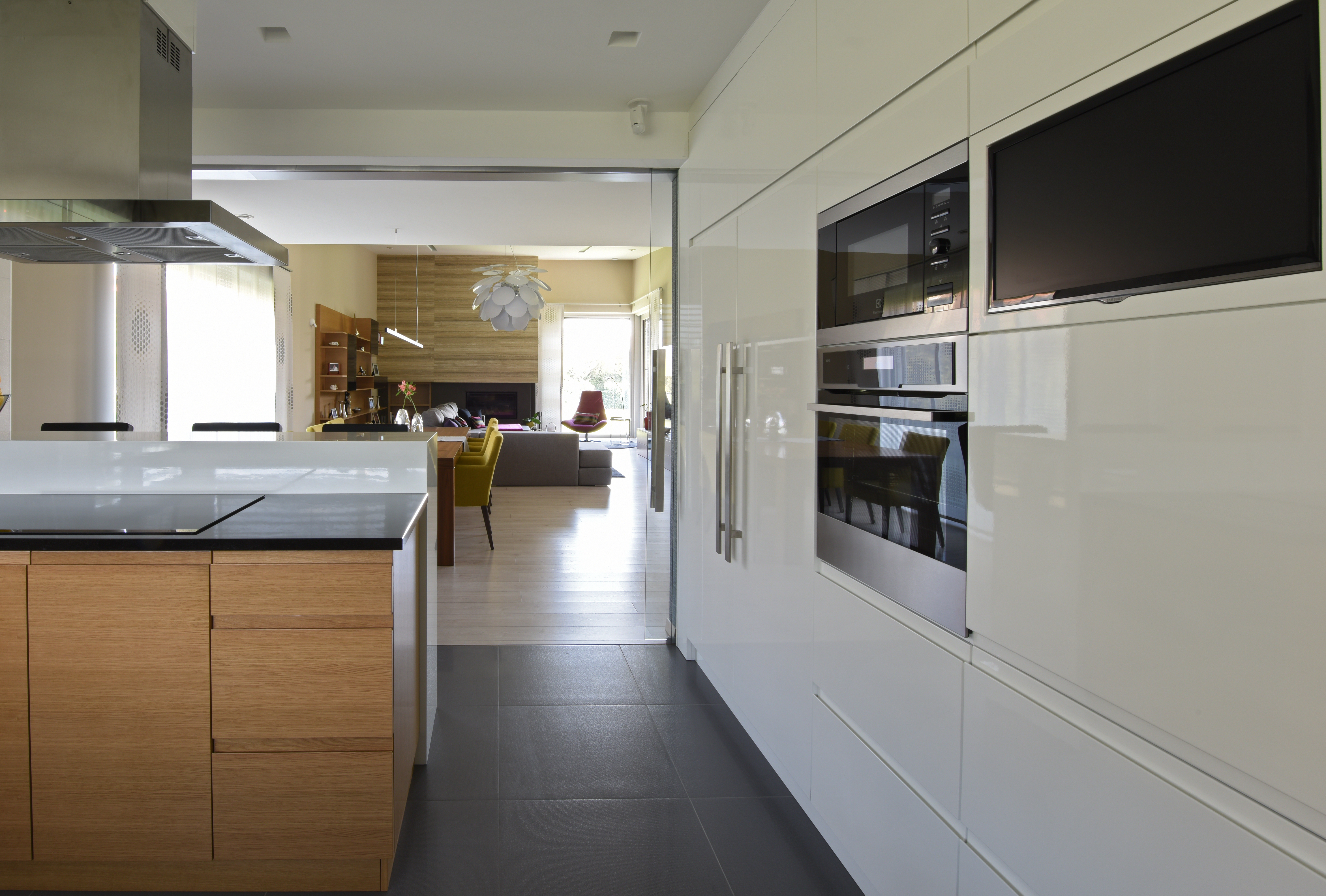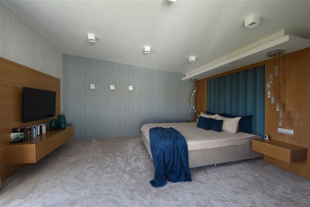 Feladat: Fiatal pár új építésú családi házának belső kialakítása két, szeparált magán szférával, illetve a közös terek minél tágasabb hatásának megtartásával. A hosszútávra tervezett, visszafogott, ám minőségi anyaghasználat mellett karakteres színek megjelenését is kérték.